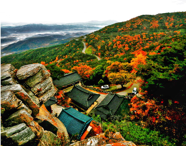 절은 깎아내린 듯한 절벽 위에 자리하여 화려한 자연과 함께 어우러져 있습니다.
