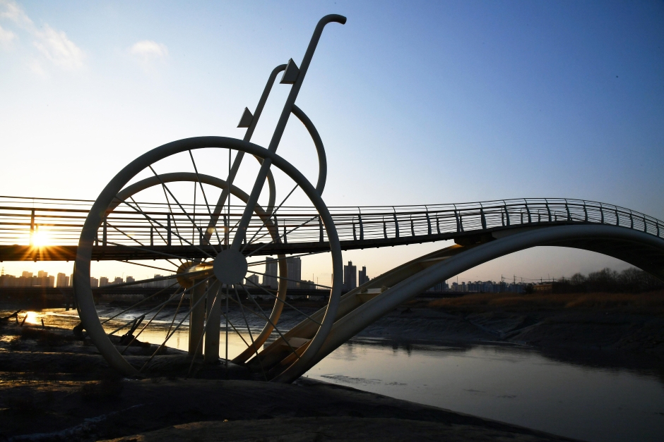 이 다리는 미래를 상징하는 생명의 다리로, 시흥시에서 사람과 자전거만 다닐 수 있는 멋진 자전거 다리로 만들어졌습니다.