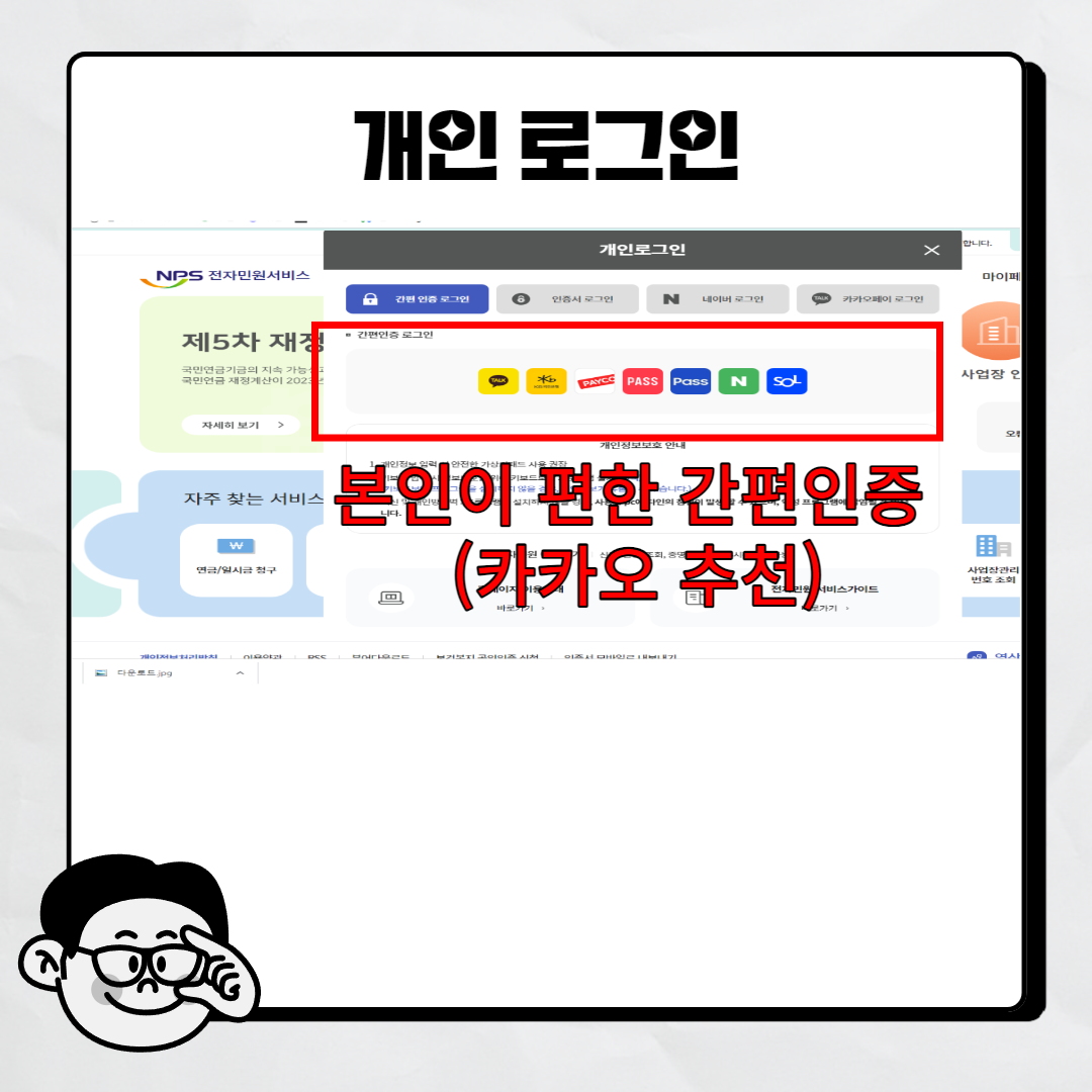 2. 개인 로그인을 하라고 팝업창이 뜹니다. 개인로그인 해주기 (카카오인증 추천)